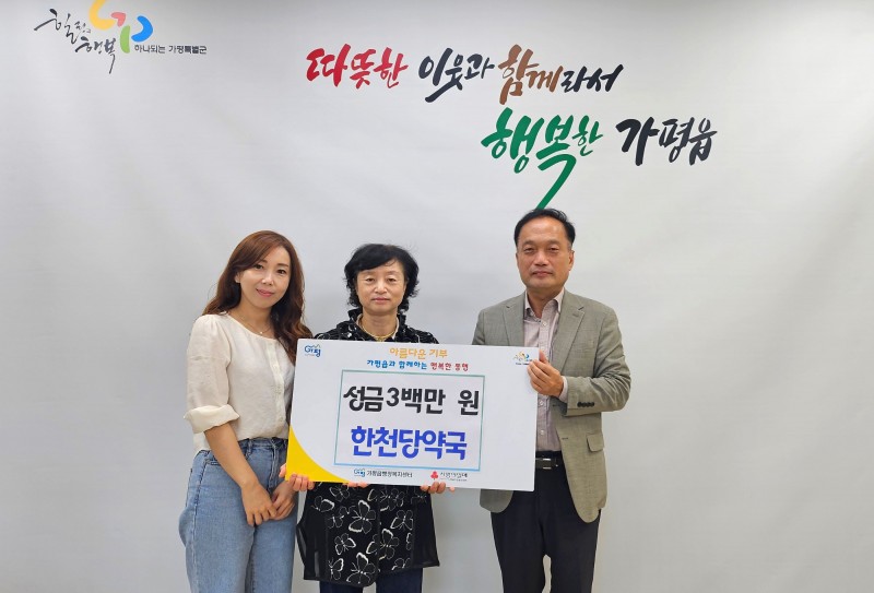 가평군 가평읍 한천당약국은 지난 24일 가평읍 행정복지센터에 방문해 취약계층 이웃을 돕기 위한 성금 300만 원을 전달했다.