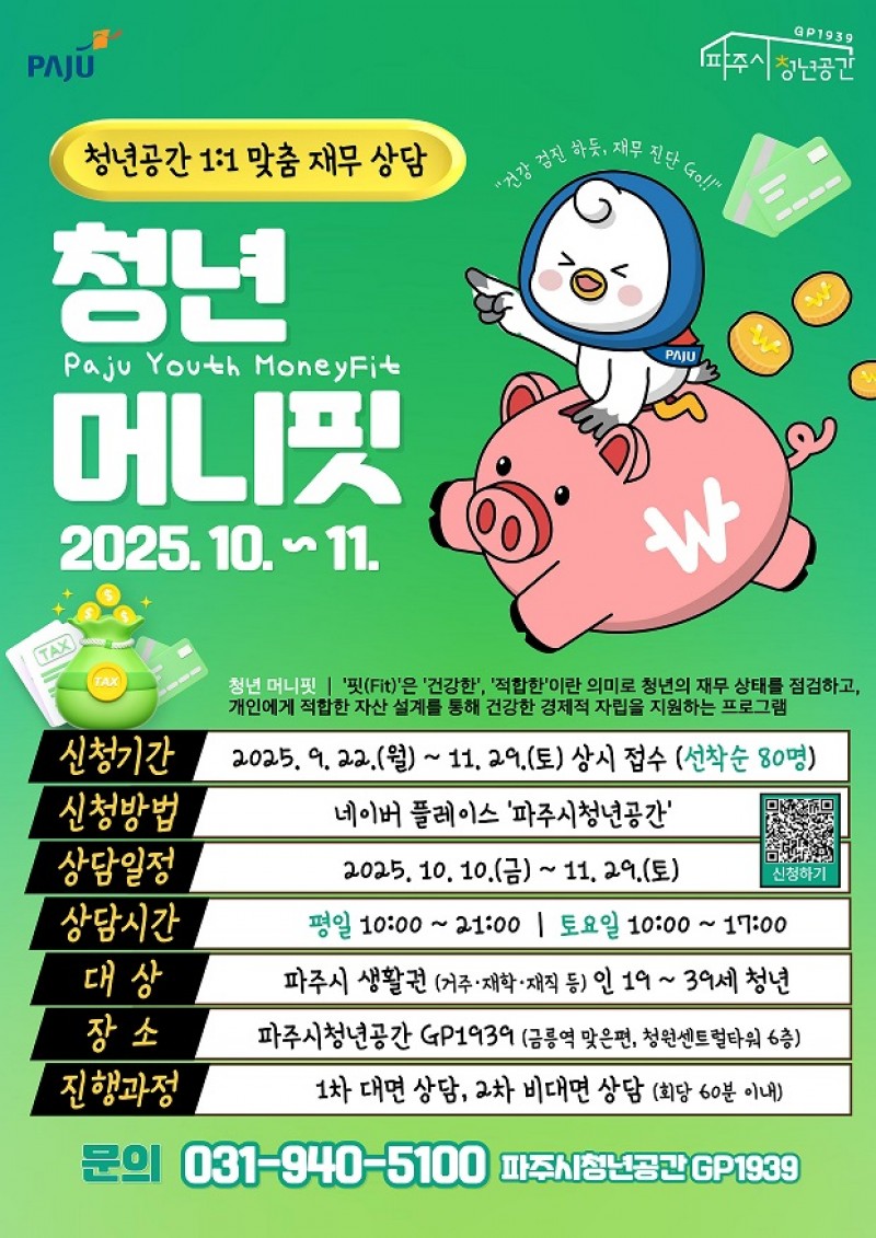 파주시는 오는 10월 10일부터 11월 29일까지 청년들의 경제 불안을 해소하고 경제적 자립을 위한 재무상식 함양을 돕는 청년 맞춤 1:1 전문 재무 상담 ‘파주청년 머니핏’을 운영한다.