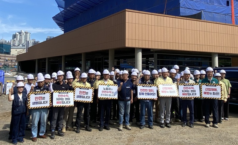참석자들은 현장 브리핑을 시작으로 용인시 동백종합복지회관 건설현장을 순회하며 추락, 끼임, 충돌, 화재 등 잠재적 위험요인을 집중적으로 점검했다. 이어 점검 결과 강평과 함께 소화기, 안전모 턱끈 등 안전물품을 노동자들에게 전달하며 근로환경 개선을 위한 지원 의지를 밝혔다.
