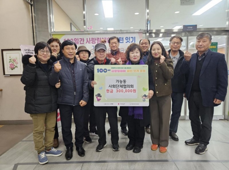 의정부시 가능동주민센터(동장 배은경)는 12월 11일 가능동 사회단체협의회(회장 이재철)가 관내 취약계층 노인들을 위해 성금 30만 원을 기탁하며 ‘100일간 사랑릴레이 배턴 잇기’에 동참했다고 밝혔다.