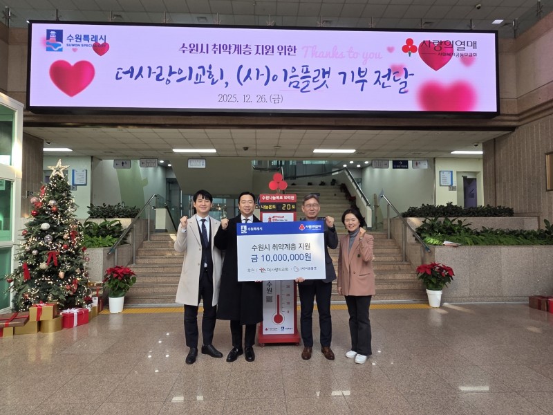 더사랑의교회가 설립한 사회복지법인 ‘이음플랫’이 “취약계층 지원을 위해 사용해달라”며 26일 1000만 원을 수원시에 기부했다. 기부금은 사회복지공동모금회에 지정기탁 방식으로 수원시 취약계층 지원에 사용할 예정이다.