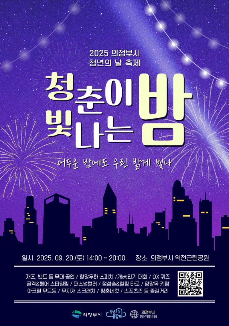 의정부시(시장 김동근)는 9월 20일 오후 2시부터 8시까지 의정부 역전근린공원에서 ‘2025년 청년의 날 축제(청춘이 빛나는 밤:청빛밤)’을 개최한다.