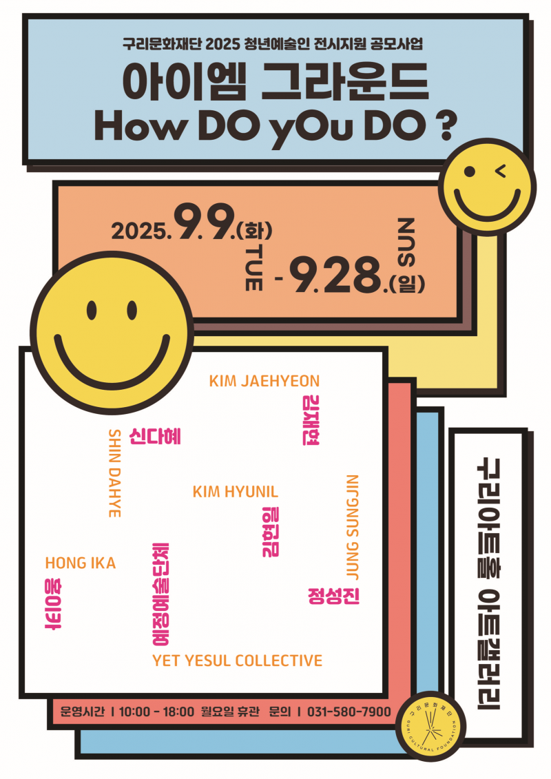 (재)구리문화재단(이사장 백경현, 대표이사 진화자)은 청년 예술인의 성장과 도약을 지원하는 청년 정책 플랫폼 사업의 일환으로, 2025년 청년예술인 전시지원 공모사업 『아이엠 그라운드, How DO yOu DO』 전시를 오는 9월 9일부터 28일까지 개최한다.