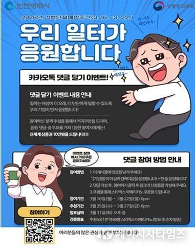 (케이시사타임즈) 인천여성가족재단 인천광역새일센터는 2026년 경력단절예방주간(3월 셋째주)를 맞아 3월 16일부터 22일까지 “우리 일터가 응원합니다.” SNS 댓글 달기를 개최한다.