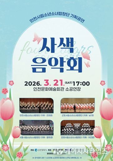 (케이시사타임즈) 인천시립소년소녀합창단(예술감독 조현경)이 오는 3월 21일 인천문화예술회관 소공연장에서 4개 도시의 목소리가 한데 어우러지는 특별한 교류연주 '사색음악회'를 개최한다.
