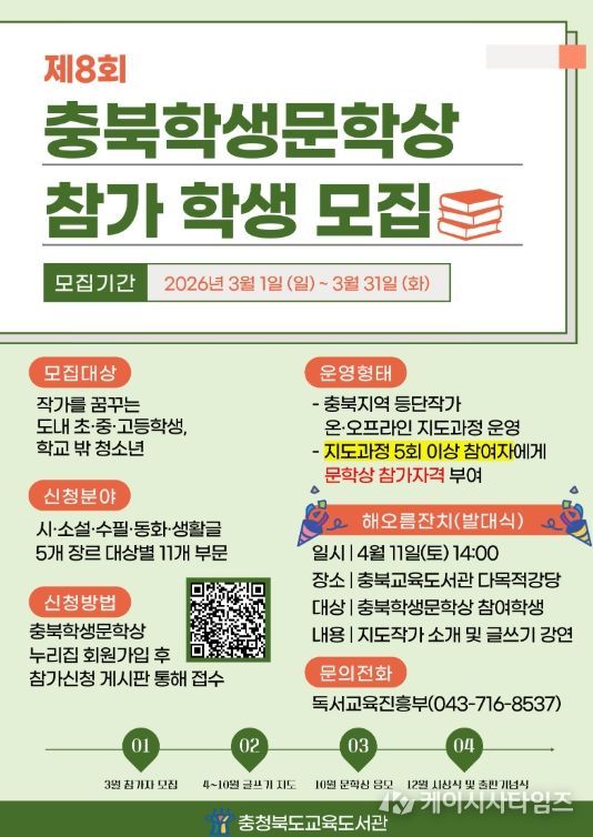 (케이시사타임즈) 충청북도교육청 직속기관 교육도서관은 작가를 꿈꾸는 청소년들의 문학 창작 활동을 지원하기 위해 '제8회 충북학생문학상' 참가자를 모집한다고 밝혔다.