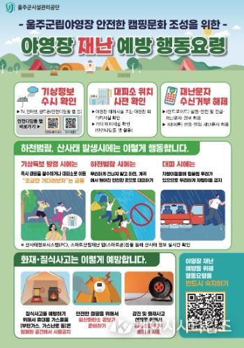 (케이시사타임즈) 울주군시설관리공단 울주군립야영장은 예측이 어려운 기상상황에 대비해 야영장 이용객의 신속한 대피를 돕기 위한 행동요령 홍보물 4천 부를 제작해 야영장 등에 배포했다고 9일 밝혔다.
