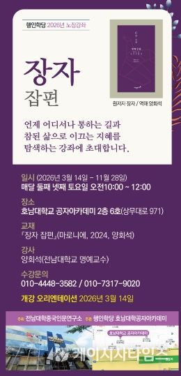 (케이시사타임즈) 전남대학교 중국인문연구소가 시민과 함께 동양 고전을 읽으며 인문학적 지혜를 나누는 ‘행인학당 2026년 노장강좌’를 개최한다.