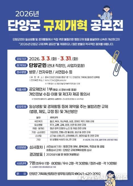 (케이시사타임즈) 단양군이 군민의 일상생활과 경제활동에서 체감하는 불합리한 행정규제를 발굴하고 개선하기 위해 ‘2026년 단양군 규제개혁 공모전’을 개최한다.