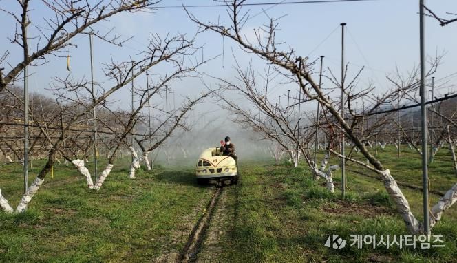 (케이시사타임즈) 옥천군농업기술센터는 복숭아 개화기를 앞두고 월동 병해충 적기 방제를 위한 현장 기술지도를 강화하고 있다.