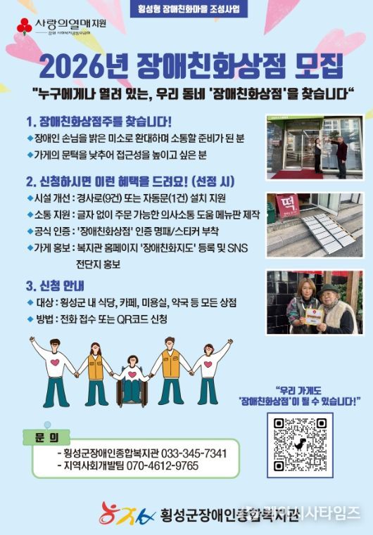 박성길 횡성군장애인종합복지관장은 “이번 모집을 통해 지역사회의 장애 인식을 개선하고 실질적인 무장애 환경을 조성해 나가겠다”며 “모두가 살기 좋은 횡성을 만드는 데 군민과 상점주들의 많은 관심과 참여를 부탁드린다”고 전했다.