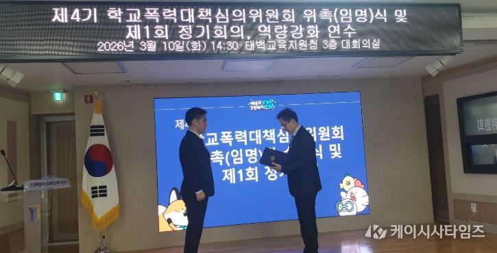 (케이시사타임즈) 태백교육지원청은 3월 10일 태백교육지원청 제4기 학교폭력대책심의위원회 위촉(임명)장 수여식 및 학교폭력대책심의위원 역량강화 연수를 실시했다.