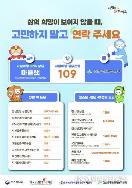주요 추진 내용은 △자살예방 상담전화 109 △자살예방 캠페인 운영 △생명지킴이 양성교육 △찾아가는 심리지원서비스 △생명사랑안심마을 조성 등이다.