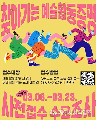 (케이시사타임즈) 강원문화재단은 도내 예술인의 복지 제도 접근성을 높이기 위한 ‘2026년 상반기 예술활동증명 등록지원 서비스’ 사전접수를 23일(월)까지 진행한다.