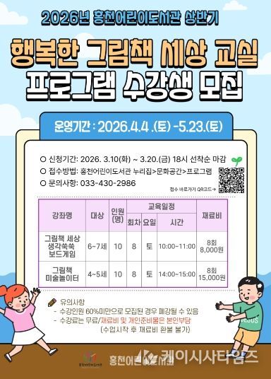 접수 기간은 3월 20일까지이며, 홍천 어린이도서관 누리집 문화공간 프로그램 메뉴에서 선착순 온라인으로 신청할 수 있다. 프로그램은 ‘그림책 세상 생각 쑥쑥 보드게임’, ‘그림책 미술 놀이터’ 두 개 강좌로 운영한다.
