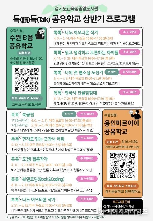 (케이시사타임즈) 경기도교육청중앙도서관이 학생들의 창의적 사고력과 진로설계 역량을 강화하기 위해 4월부터 7월까지 녪년 상반기 톡(讀)톡(talk) 공유학교’를 운영한다.