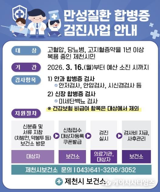 (케이시사타임즈) 제천시보건소는 고혈압, 당뇨병 등 만성질환자의 합병증을 조기에 발견하고 중증질환으로의 진행을 예방하기 위해 ‘만성질환 합병증 검진 지원사업’을 추진한다고 밝혔다.