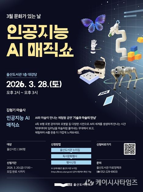 (케이시사타임즈) 울산도서관은 오는 3월 28일 오후 2시 도서관 1층 대강당에서 3월 문화가 있는 날 행사로 ‘인공지능(AI) 마술(매직)쇼’ 공연을 개최한다고 밝혔다.