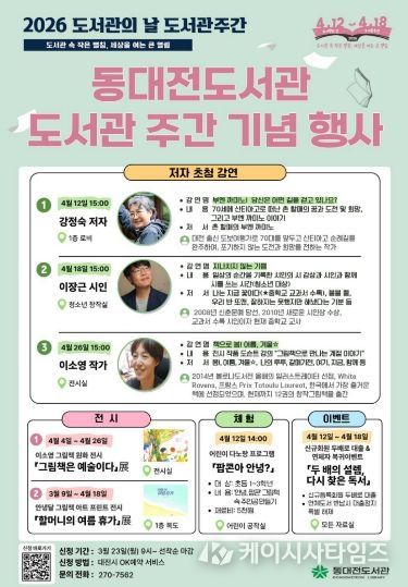 (케이시사타임즈) 동대전도서관은 도서관의 날(4월 12일)과 도서관 주간(4월 12일~18일)을 맞아 시민들의 독서문화 향유 기회를 확대하고 도서관 이용을 활성화하기 위해 다양한 독서문화 행사를 운영한다.