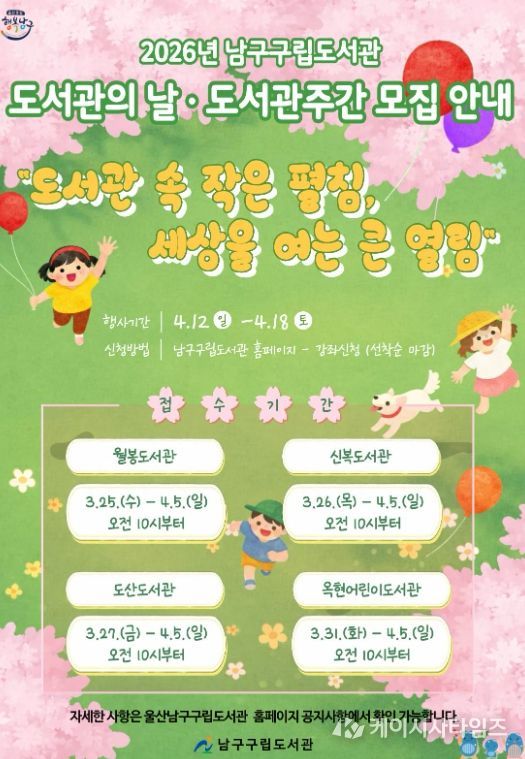 (케이시사타임즈) 울산 남구 구립도서관은 ‘2026년 도서관의 날·도서관 주간’을 맞아 지역 주민들이 다채로운 문화·체험활동을 접할 수 있도록 오는 25일부터 4월 5일까지 도서관 주간 프로그램 수강생을 모집한다.