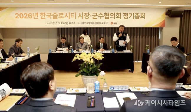 (케이시사타임즈) 태안군이 지난 23일 태안군해양치유센터에서 한국 슬로시티 회원 시·군 지자체장 및 관계 공무원, 한국슬로시티본부 관계자 등 60여 명이 참석한 가운데 ‘2026년 한국슬로시티 시장·군수협의회 정기총회’를 개최했다.
