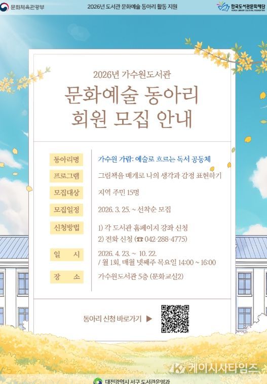 (케이시사타임즈) 대전 서구 가수원도서관은 ‘2026년 도서관 문화예술 동아리 활동 지원사업’의 일환으로, 그림책 심리·정서 프로그램 신규 회원을 모집한다고 24일 밝혔다.