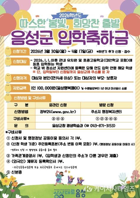(케이시사타임즈) 음성군은 올해 2026학년도 입학을 맞아 관내 유치원과 초·중·고등학교 입학생, 그리고 학교 밖 청소년지원센터에 등록된 입학 연령에 해당되는 청소년을 대상으로 입학축하금을 지원한다고 밝혔다.