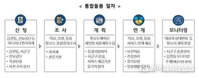 통합돌봄 서비스 신청․접수는 관할 지자체 읍면동 또는 건강보험공단 지사를 방문하거나 우편․팩스를 통해 할 수 있으며, 신청자의 돌봄 필요도 조사와 개인별 지원계획 수립 절차를 거쳐 시군 전담부서에 설치된 통합지원회의를 통해 제공서비스가 최종 확정된다.