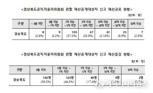 (케이시사타임즈) 경상북도공직자윤리위원회(위원장 이순동)는 소관 재산공개 대상자 282명*의 정기 재산변동사항 신고내역을 경상북도 도보 및 공직자윤리시스템을 통해 이번 달 26일자로 공개했다.