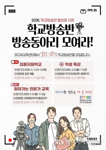 (케이시사타임즈) 충청북도교육청 직속기관 교육연구정보원(원장 이찬동) 미디어교육센터는 학교 방송활동 활성화와 학생 미디어 제작 역량 강화를 위해 '2026 학교방송반 활성화 지원' 프로그램을 운영한다.