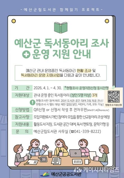 (케이시사타임즈) 예산군 공공도서관은 지역 내 독서동아리 활동을 체계적으로 지원하고 독서공동체 기반을 넓히기 위해 ‘2026 독서동아리 운영 지원사업’을 추진한다.