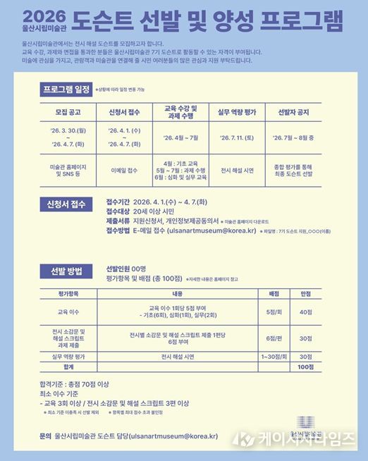 (케이시사타임즈) 울산시립미술관은 시민과 함께하는 전시 문화 확산과 미술관 전문해설 인력양성을 위해 ‘2026년 전시해설사(도슨트) 양성 프로그램’ 참여자를 모집한다고 밝혔다.