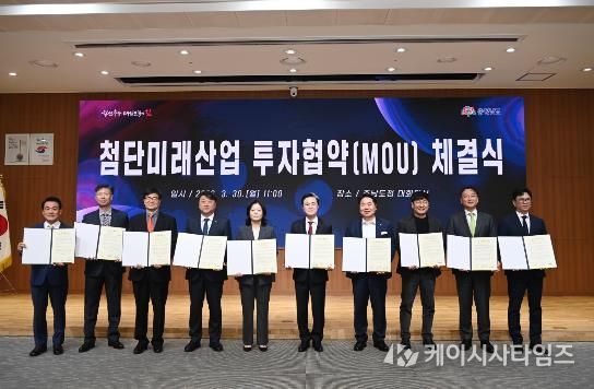 김태흠 지사는 30일 도청 대회의실에서 오세현 아산시장 등 3개 시군 시장·군수, 김동회 디앤알파트너스 대표이사 등 6개 기업 대표와 투자협약(MOU)를 체결했다.