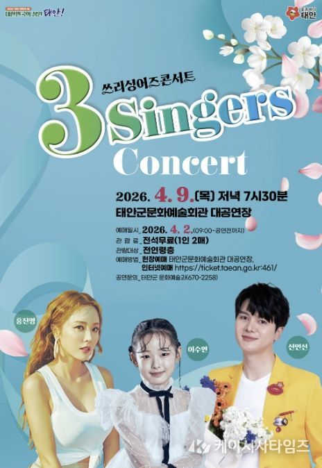 (케이시사타임즈) 태안군이 4월 9일 태안군문화예술회관 대공연장에서 홍진영 등 유명 가수가 출연하는 ‘3-Singers 콘서트’를 개최한다.