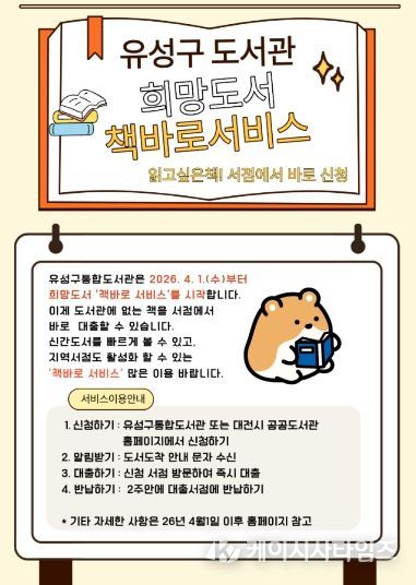 (케이시사타임즈) 대전 유성구는 4월 1일부터 도서관을 방문하지 않고 집 근처 동네 서점에서 원하는 책을 바로 빌려볼 수 있는 ‘희망도서 책바로 서비스’를 운영한다.