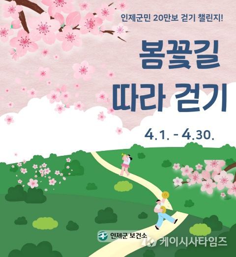 (케이시사타임즈) 인제군이 군민의 일상 속 걷기 실천을 확산하고 건강한 생활문화를 만들기 위해 4월 1일부터 4월 30일까지 ‘4월 한달 간 20만보 걷기챌린지’를 운영한다.