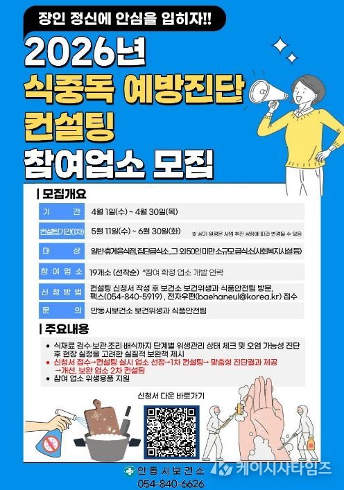 (케이시사타임즈) 안동시는 식중독 발생 우려가 높은 업소를 대상으로 위생 수준 향상과 사전 예방을 위해‘2026년 식중독 예방진단 컨설팅’ 참여업소를 모집한다고 밝혔다.