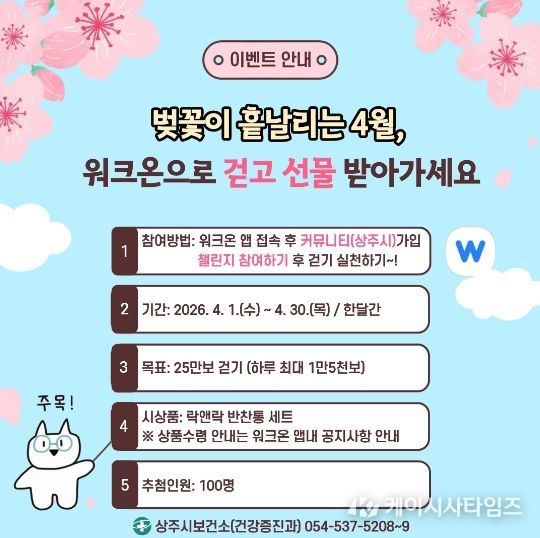 이번 챌린지는 상주시민 누구나 참여할 수 있으며, 모바일 걷기 앱 ‘워크온(WalkOn)’을 활용해 일상 속 걷기 실천을 유도하고 시민들의 자발적인 건강관리를 지원하는 데 목적이 있다.