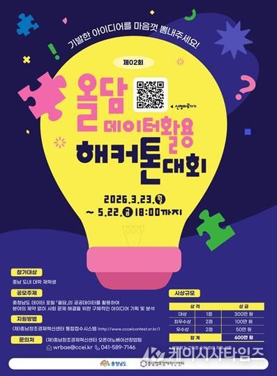 (케이시사타임즈) 충남창조경제혁신센터는 충남도내 대학 재학생을 대상으로 공공데이터를 활용한 창의적 아이디어 발굴을 위한 '제2회 올담 데이터 활용 해커톤' 참가자를 오는 5월 22일까지 모집한다고 밝혔다.