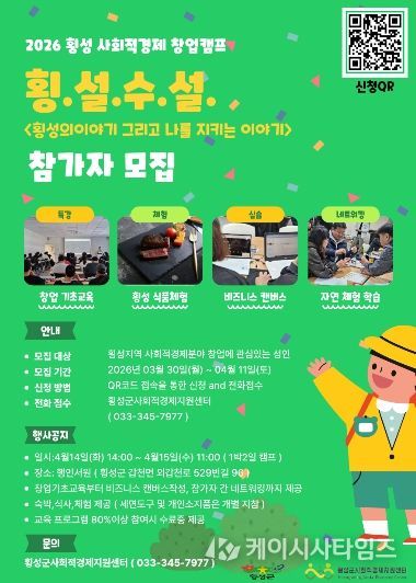 횡성군 사회적경제 지원 센터는 지역 내 사회적경제 활성화와 창업 생태계 조성을 위한 ‘2026 횡성 사회적경제 창업 캠프 '횡.설.수.설.'’ 참가자를 모집 중이라고 4일 밝혔다.