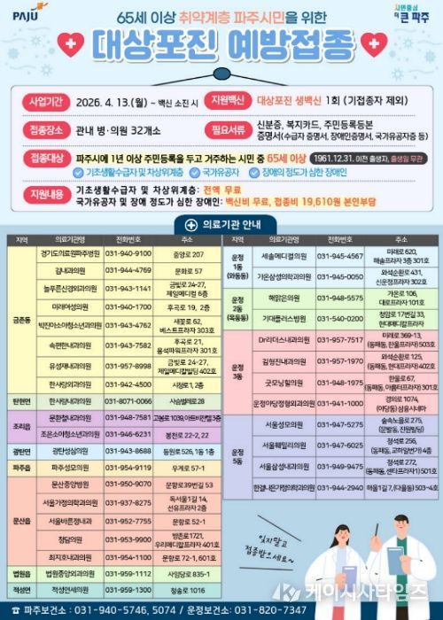 (케이시사타임즈) 파주시는 65세 이상 취약계층 어르신의 건강 보호와 의료비 부담 완화를 위해 취약계층 어르신 대상포진 예방접종 지원사업을 오는 4월 13일부터 시행한다.