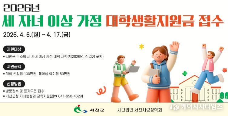 (사)서천사랑장학회는 ‘2026년도 상반기 세 자녀 이상 가정 대학생활지원금 지원계획’을 공고하고, 오는 4월 6일부터 17일까지 2주간 지원 신청을 받는다.