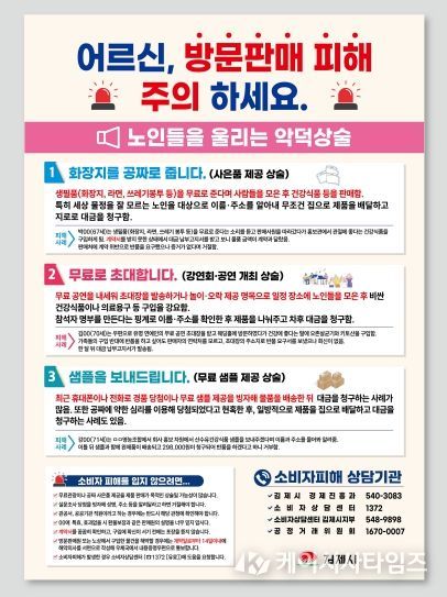 (케이시사타임즈) 김제시가 최근 고령층을 대상으로 한 방문판매 홍보관(일명 ‘떴다방’) 영업이 확산됨에 따라 소비자 피해 예방을 위한 시민들의 각별한 주의를 당부했다.
