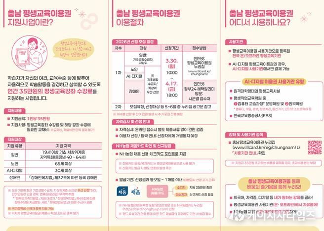 한편, 신청 및 카드발급 등 관련 문의는 충남 평생교육이용권 상담콜센터 또는 누리집 게시판을 통해 확인할 수 있다.