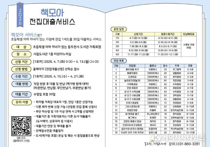 (케이시사타임즈) 동두천시 시립도서관은 2026년 4월부터 12월까지 ‘책모아’ 전집 대출 서비스를 총 5회에 걸쳐 운영한다고 밝혔다.