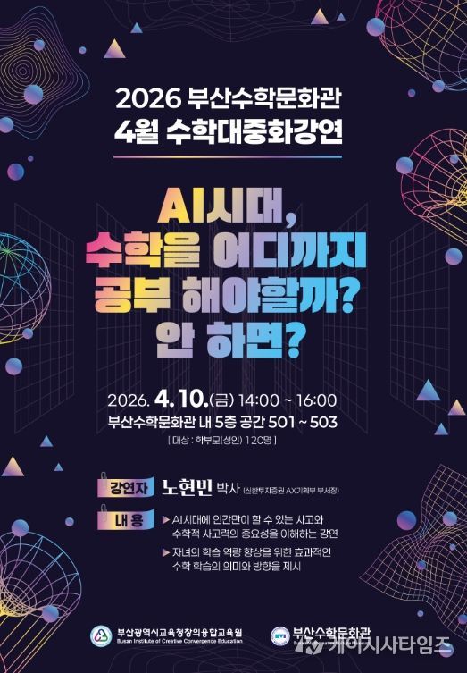 (케이시사타임즈) 부산광역시교육청창의융합교육원 분원 부산수학문화관은 오는 10일 오후 2시 부산수학문화관에서 학부모 및 시민 120여 명을 대상으로 ‘4월 수학대중화 강연’을 개최한다.