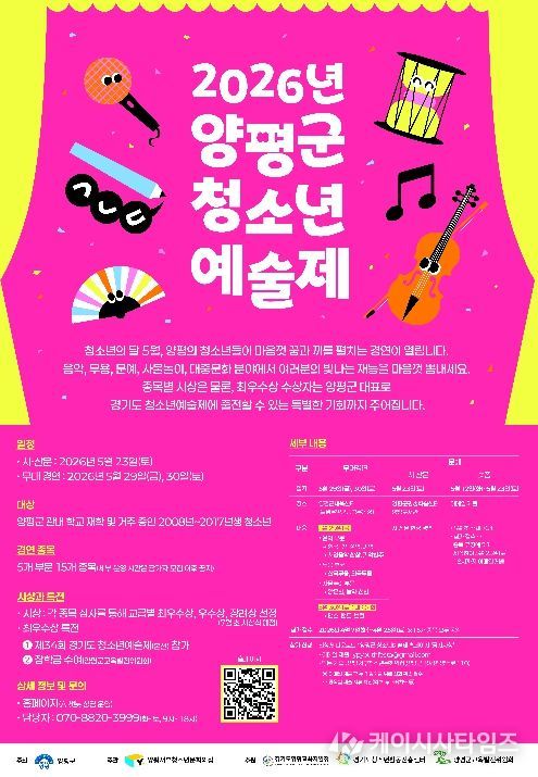 (케이시사타임즈) 양평군이 주최하고 양평서부청소년문화의집이 주관하는 ‘2026년 양평군 청소년예술제’가 오는 5월 개최되며, 4월 7일부터 25일까지 예술제 참가자를 모집한다.