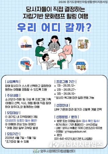 (케이시사타임즈) 양주시장애인자립생활센터에서는 장애인 당사자가 직접 선택하고 결정하는 자립 기반 힐링 여행을 목적으로 하는 지역 장애인 문화캠프 [우리 어디 갈까?] 참가자를 모집한다.