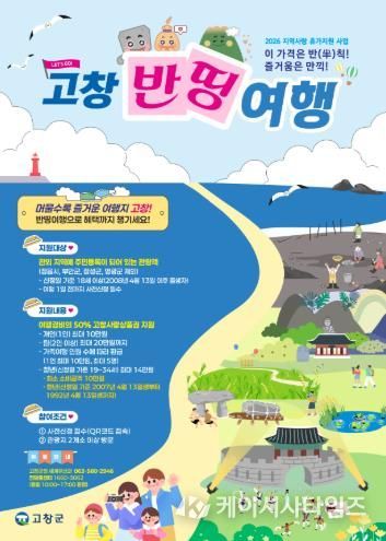 (케이시사타임즈) 고창군이 문화체육관광부와 한국관광공사 주관의 ‘2026 지역사랑 휴가지원 시범사업’ 에 전북에서 유일하게 선정되며, 체류형 관광 활성화와 지역경제 선순환을 위한 ‘고창반띵여행’을 본격 추진한다.