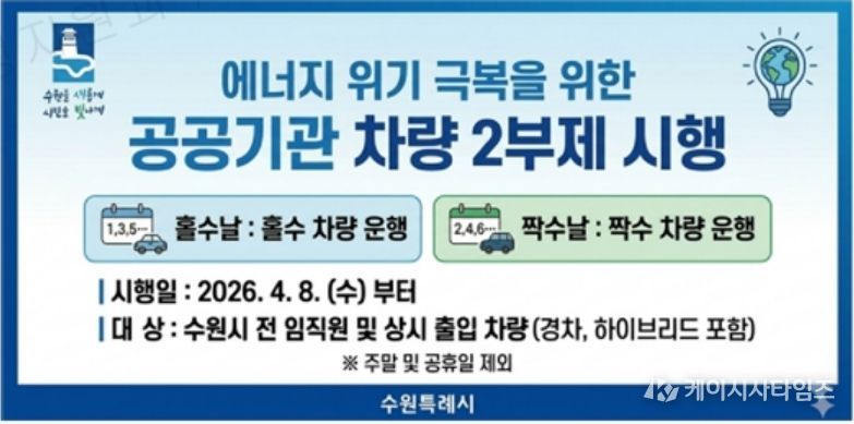 (케이시사타임즈) 수원시 장안구는 최근 심화되는 국가 자원 안보 위기 극복에 동참하기 위해 구청 부설주차장 방문 시민을 대상으로 승용차 5부제를 2026.4.8.부터 전격 시행한다고 밝혔다.